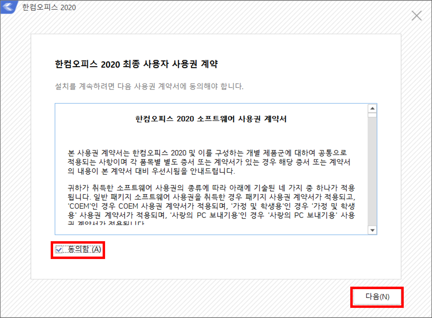 3. 한글 2020 소프트웨어 사용권 동의함 체크 후 다음 버튼을 클릭합니다.