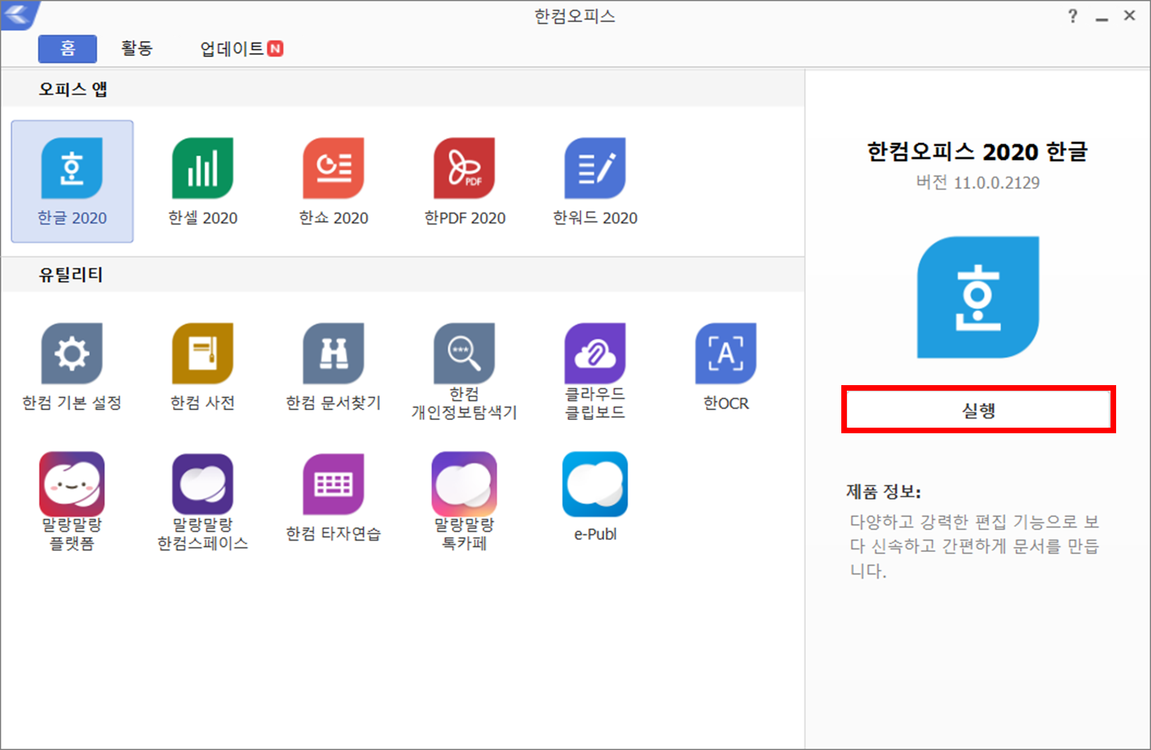 8. 한글 2020 을 선택 후, "실행" 버튼을 클릭하여 한글을 실행합니다.
